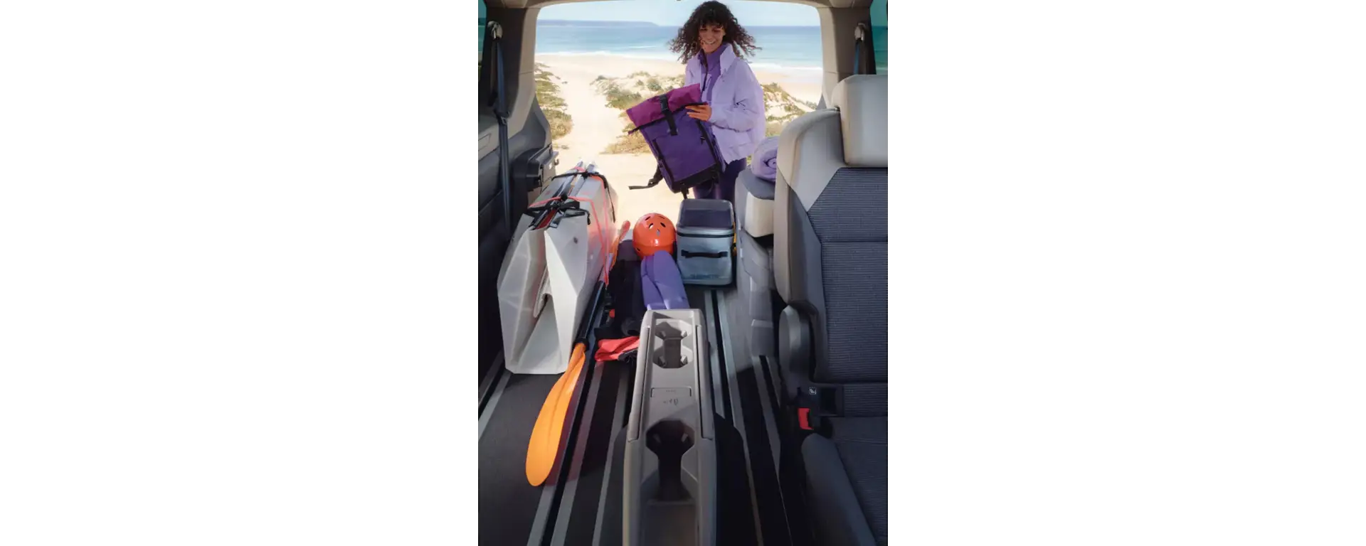 Ancora più spazio per il tuo campeggio: al posto del freno di stazionamento manuale, il freno di stazionamento elettrico permette il passaggio tra i sedili anteriori (entrambi girevoli e regolabili in altezza) per raggiungere l'abitacolo di Nuovo California.